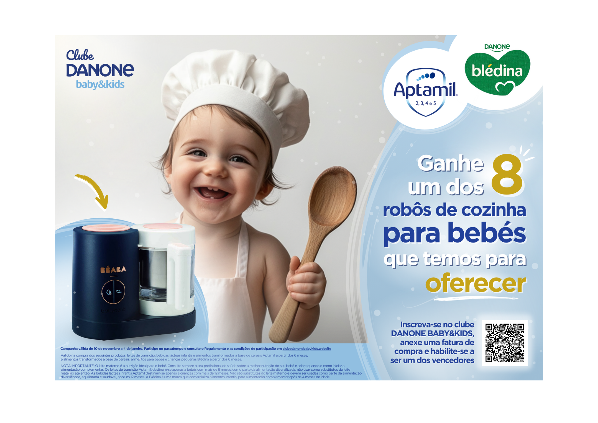 *Leites de transição, bebidas lácteas infantis e alimentos transformados à base de cereais Aptamil a partir dos 6 meses, e alimentos transformados à base de cereais, alimentos para bebés e crianças pequenas Blédina a partir dos 6 meses.